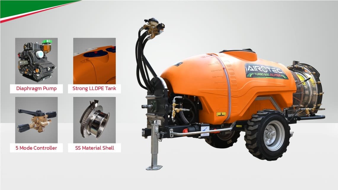 The Airotec Turbo 600 Alpha is a powerful and reliable orchard sprayer pump designed for efficient and safe spraying in orchards and vineyards. It comes with a strong 75 LPM pump and a high-performance 616 mm fan that delivers strong air output of 32 m/s, ensuring even coverage on all plants. This sprayer has a 600-liter tank that is both durable and chemical-resistant, giving it a long life in harsh working conditions. Its compact tank design and 3-axis toe bar make it easy to move through narrow vineyard rows without damaging vines or grape plants. It’s perfect for grape and pomegranate growers who need precise and gentle spraying. Read More